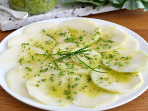 Kohlrabi schälen, in hauchdünne Scheiben schneiden und gleichmäßig auf einem flachen Teller verteilen. Das Dressing auf den Kohlrabischeiben verteilen. Je nach Geschmack noch mal mit Salz und Pfeffer würzen (eigentlich ist das Pesto schon gewürzt). Ca. 2 Stunden marinieren lassen, dann mit Schnittlauch garnieren.