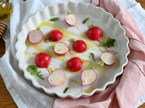 Die Radieschen auf einem Backblech oder in einer feuerfesten Form verteilen und im Backofen bei 200 °C Ober- und Unterhitze ca. 15 Minuten rösten.