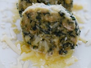 Spinatknödel mit der Schaumkelle herausnehmen, gut abtropfen lassen und vor dem Servieren etwas braune Butter und Parmesan über jeden Knödel geben.